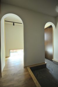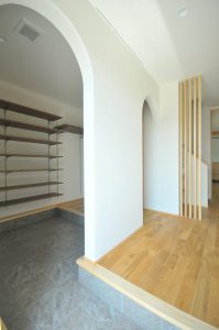 またこちらのお家では、今はアーチ壁部分をオープンにしていますが将来的にはロールスクリーンを取り付けられるようにしてあります。
