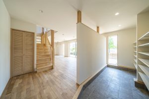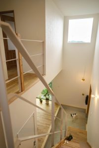 吹き抜け・大きめ真四角の窓がある事で明るい玄関に。