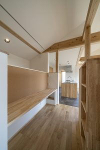 ↑ キッチン横に造られたワークスペース。ご家族の希望で、デスク前はコルクにし親子共に学校行事を確認できるようにしてあります。