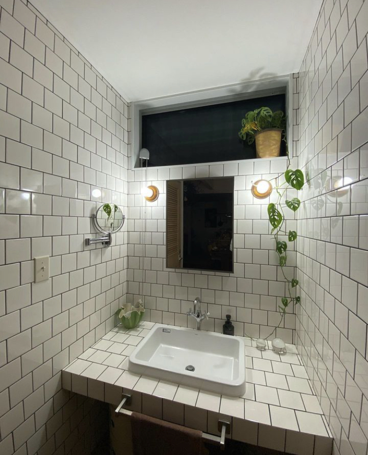 造作の棚で収納スペース・手洗いスペース・植物を飾る棚…