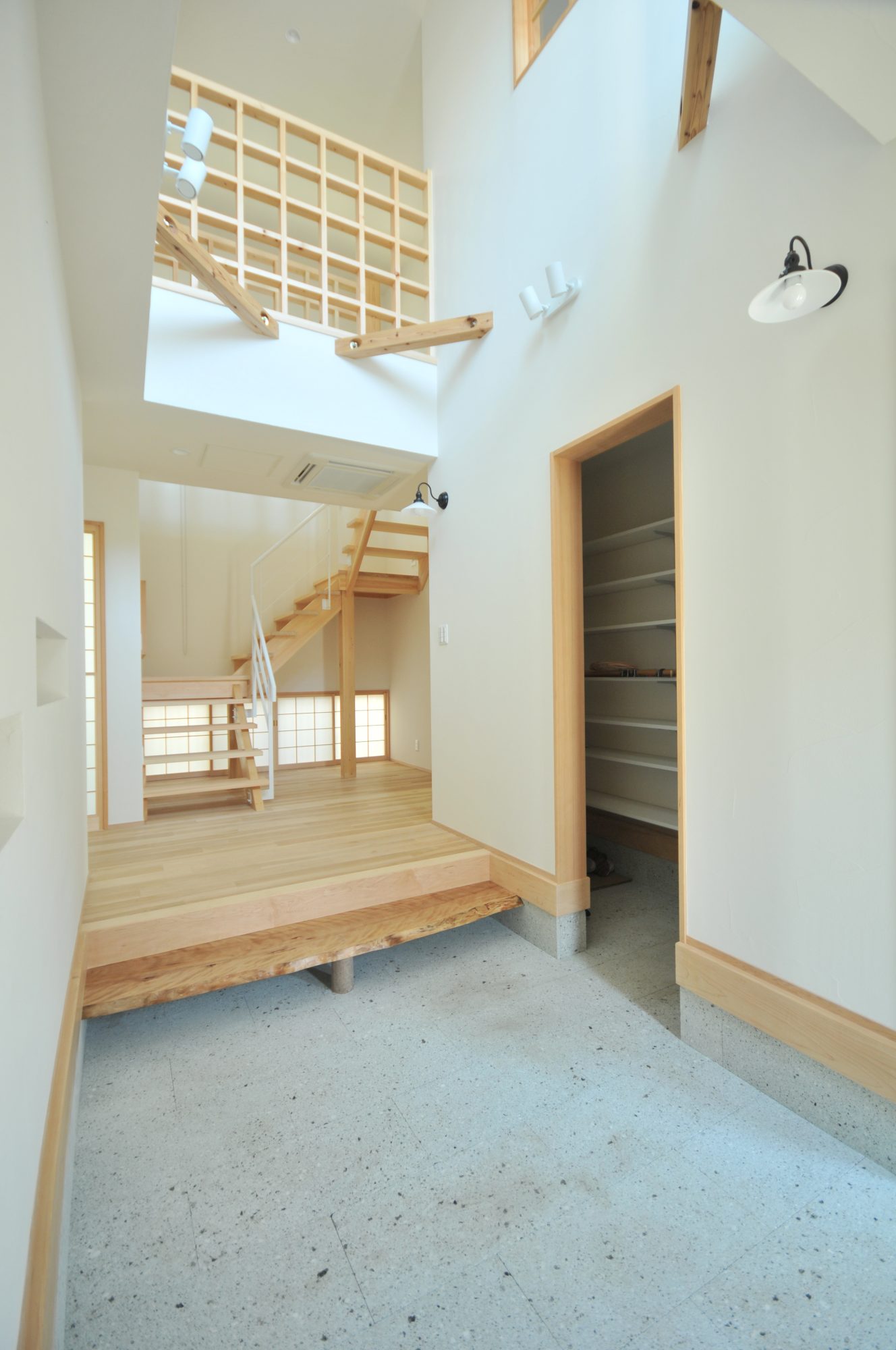 ↑吹き抜けで明るく開放感のある玄関に
