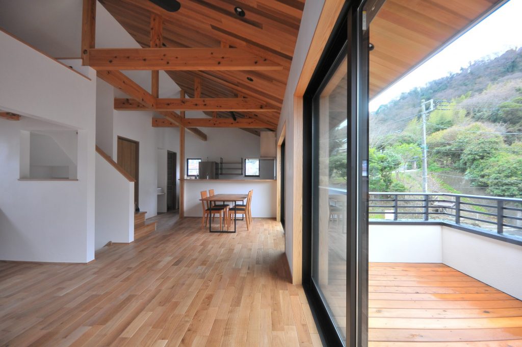 高窓を付けたり大開口サッシを採用することで、視線が外にも行くため外の緑や空との一体感が生まれてより心地よい空間