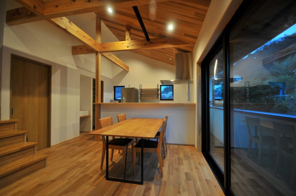 ダイニングテーブル・サッシのブラック色と外の景色との組み合わせ感が良く景色を楽しめる