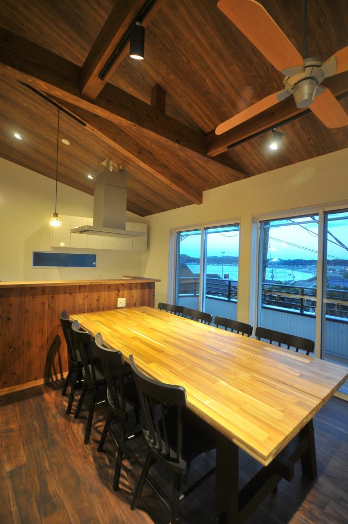 8人掛けできるダイニングテーブル。来客時にもシーリングファン・複数の窓で、臭いにも困らず