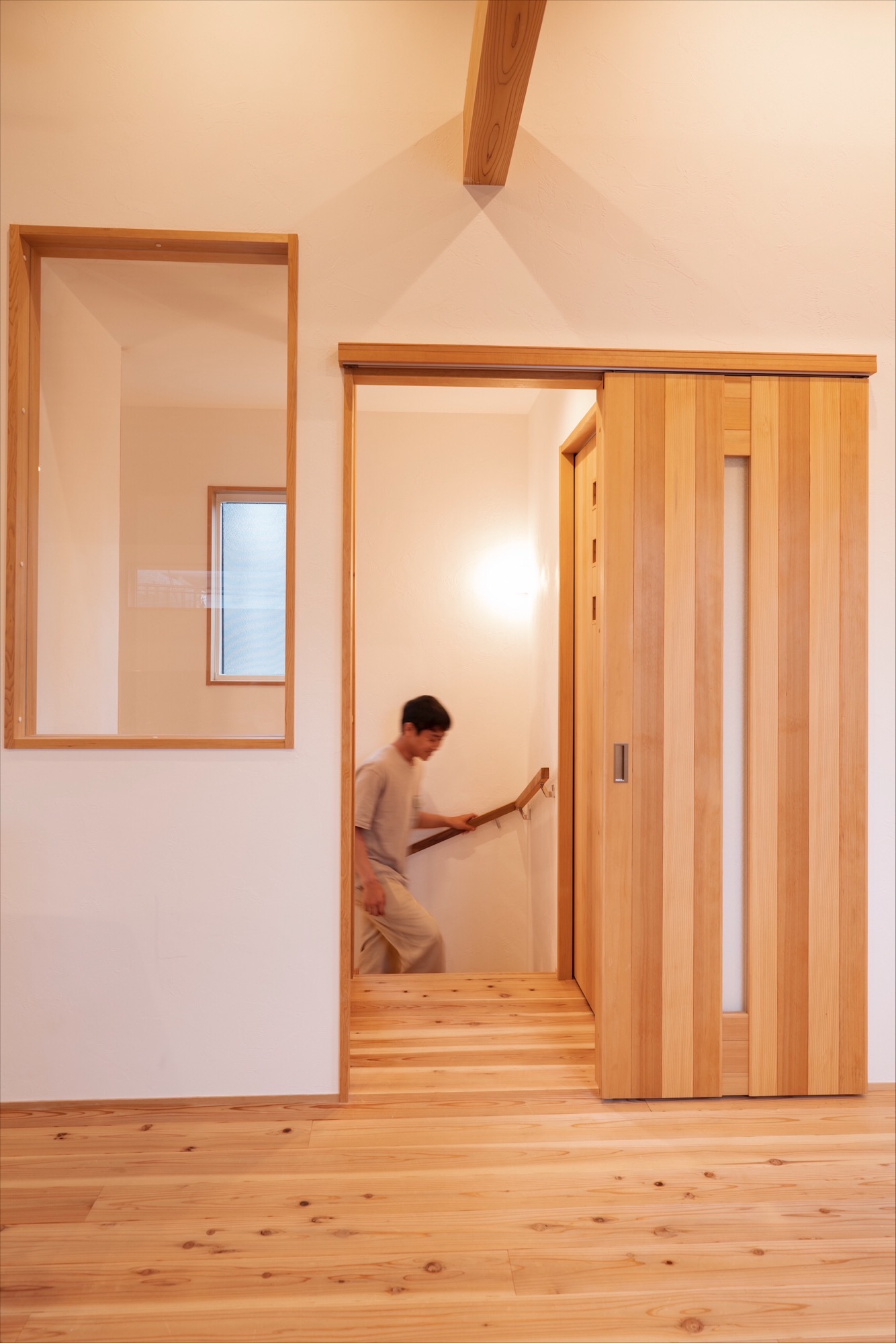 ↑ご夫婦・お子さまの健康第一に考え、フローリング・巾木・窓枠・室内扉など、手に触れるもの全て天然木を用いた湘南の家