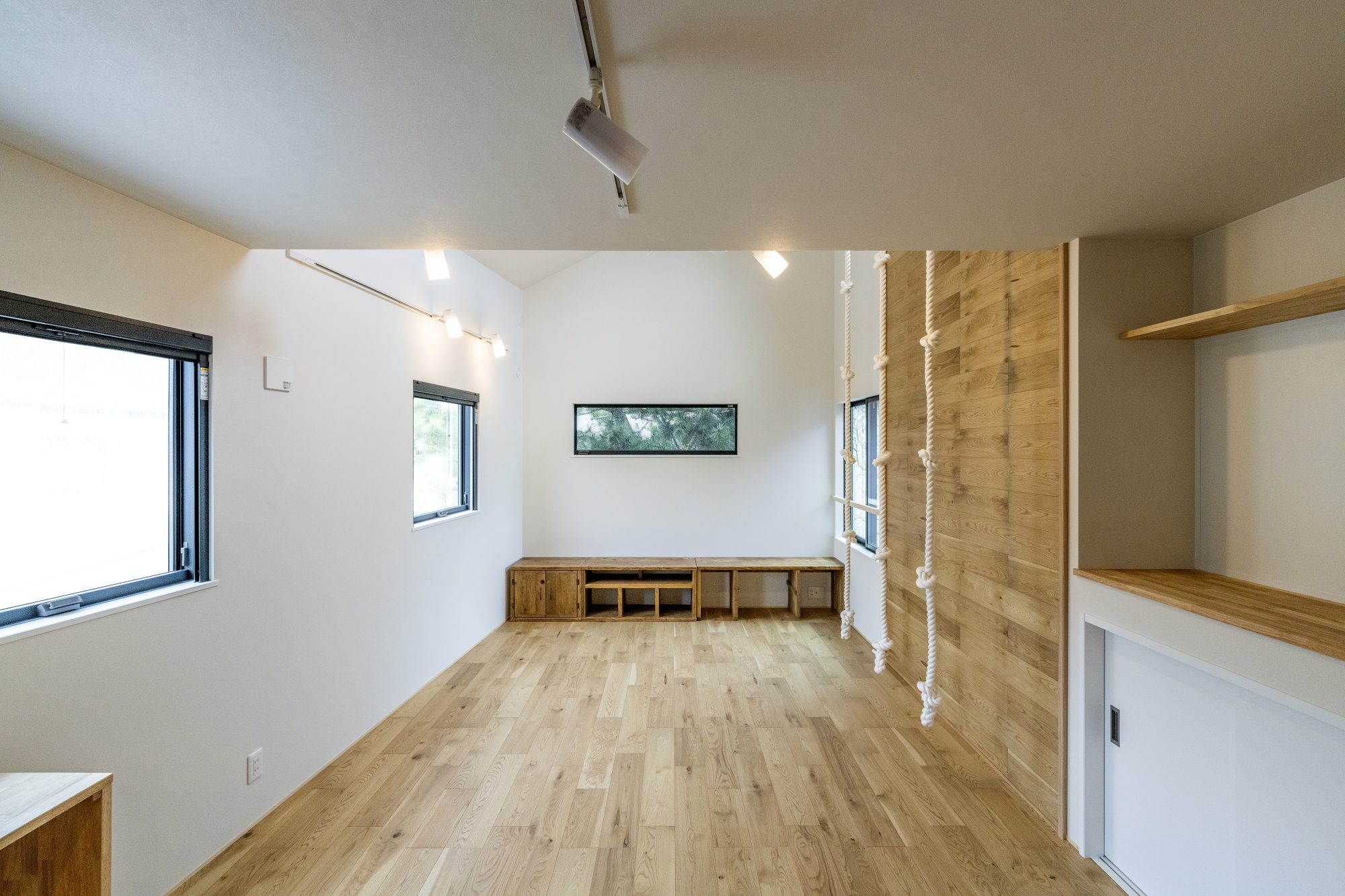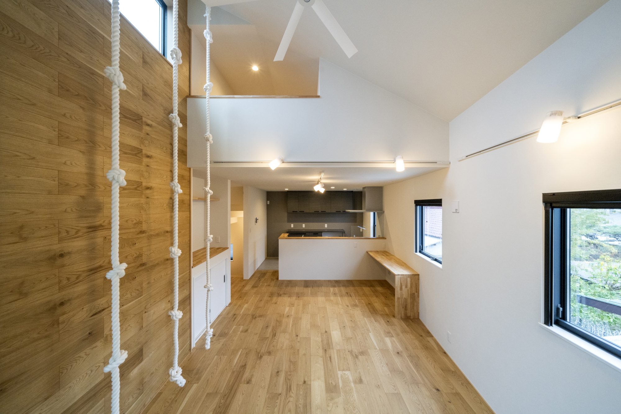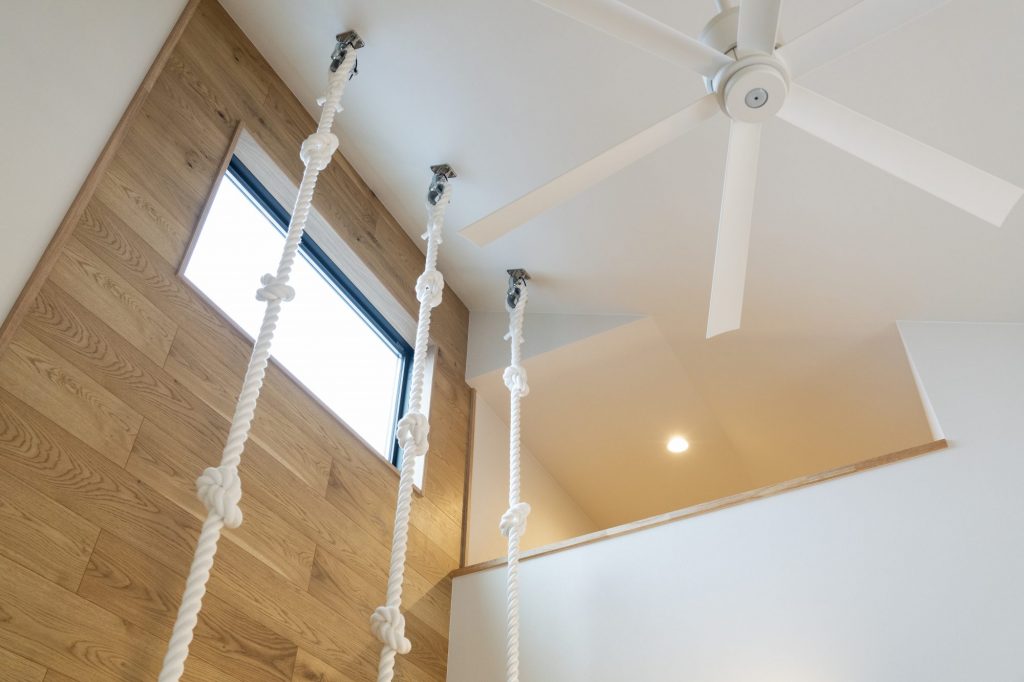 お子さま3人いるお家の2階リビングスペースに作られたターザンロープのある家です。