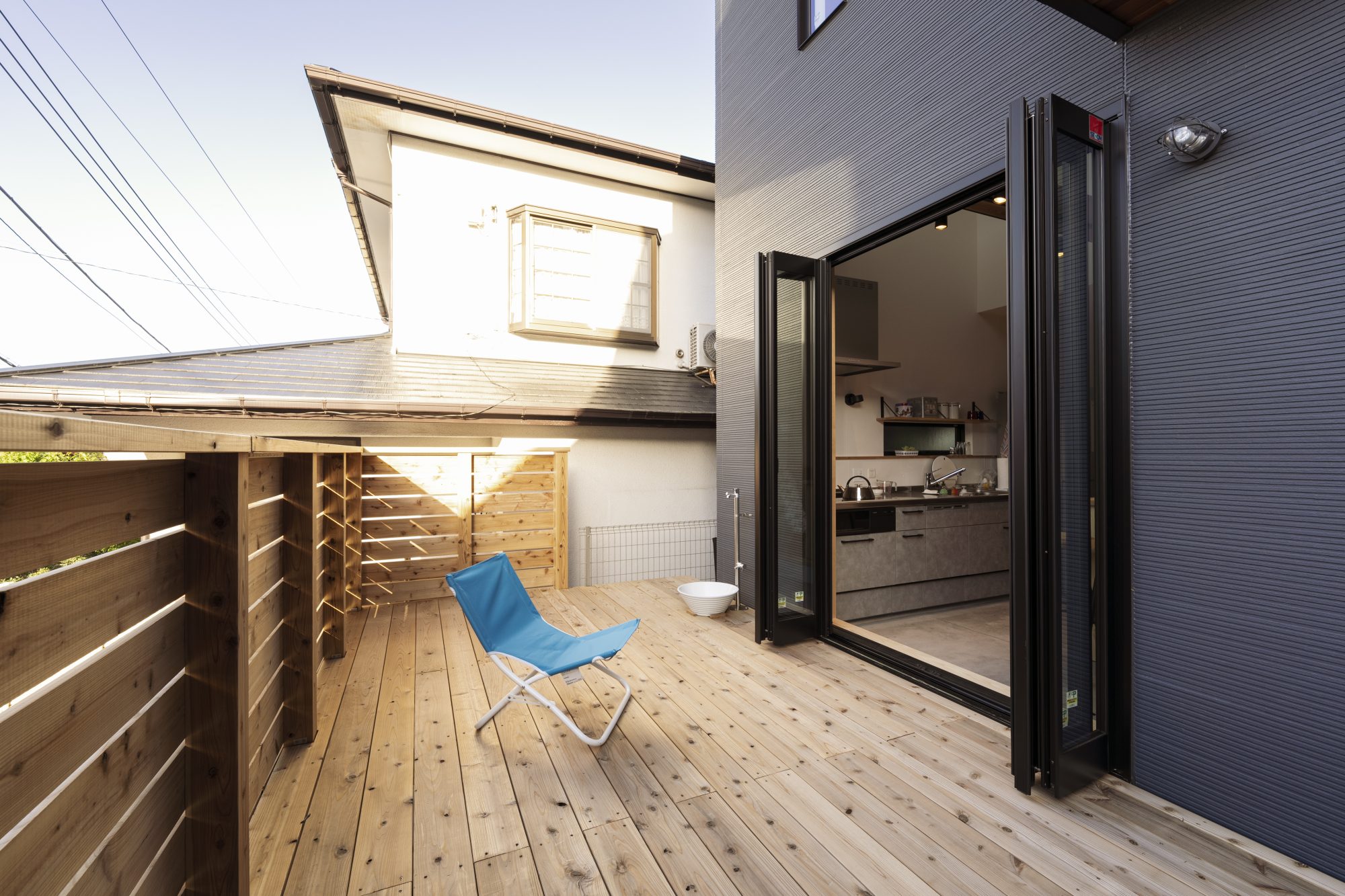フルオープンサッシダイニングから繋がる土間キッチンの横には、天竜杉のウッドデッキ。