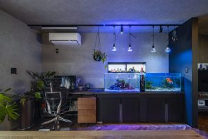 ↑趣味を取り入れたアクアリウム・ガレージハウスの家