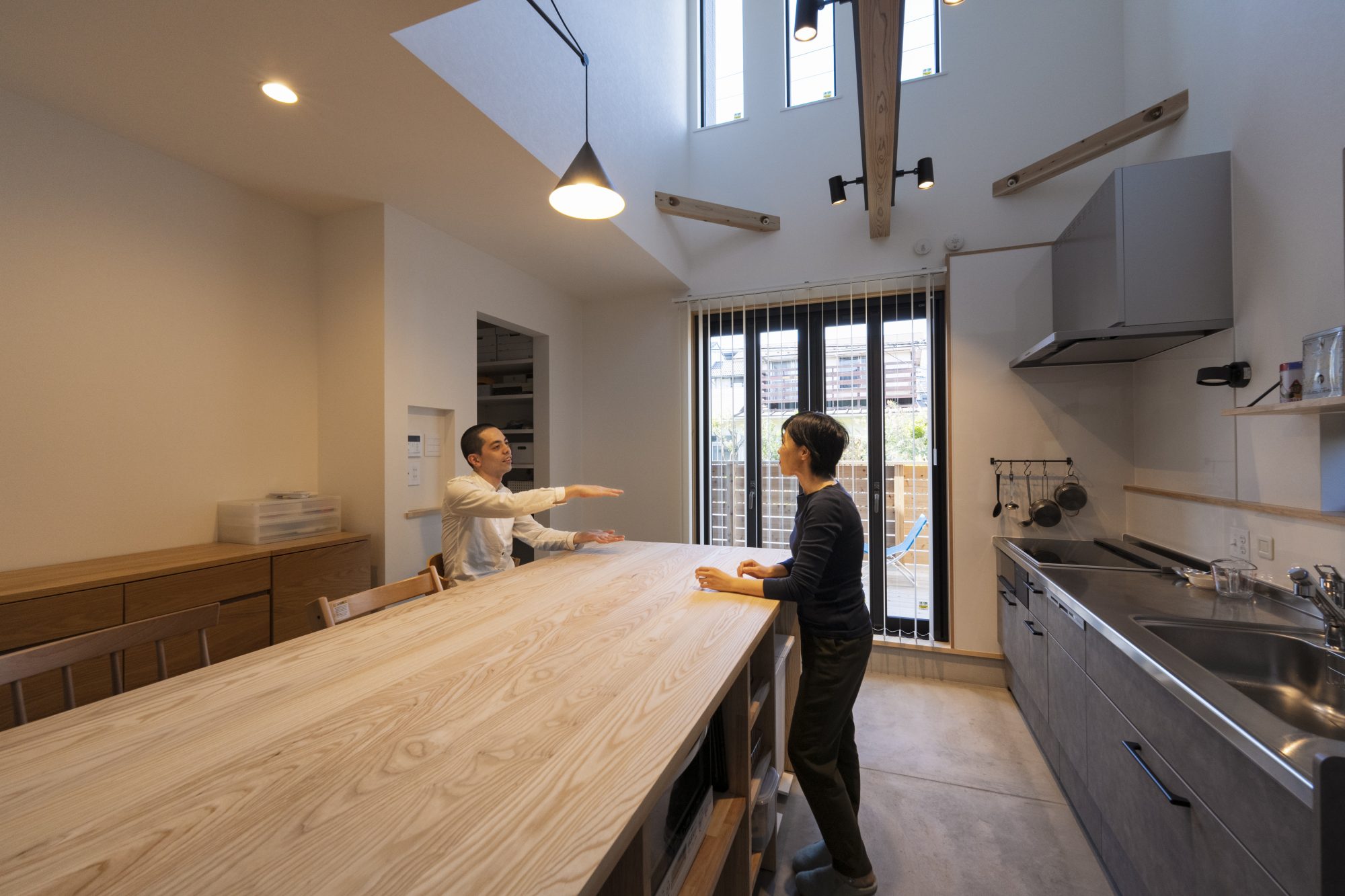 キッチンとダイニングテーブルが一体となり、リビングの中心に。