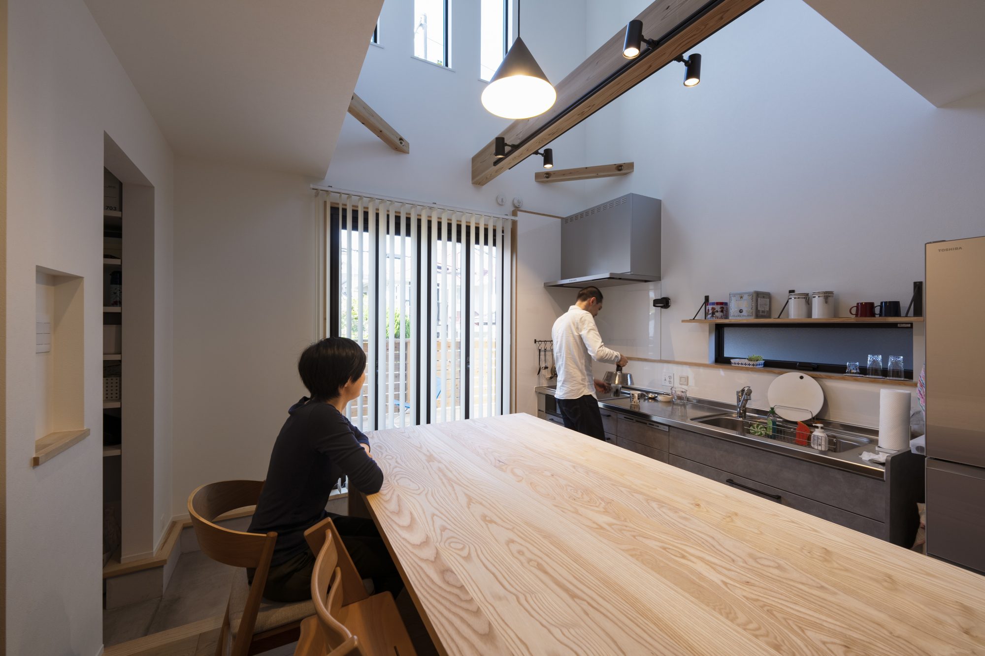 お料理に集中できるメリット以外として、リビングを広く使えたり、キッチン後ろにダイニングテーブルを置くことで配膳の動線もスムーズになります。
