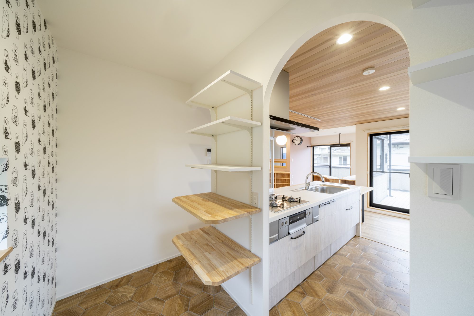 ↑L型キッチンとなっていますが、家族全員で作業が出来るようにキッチン・リビングの境目にアイランドカウンターを設けています。会話も弾み、家事動線にも困らない作りが魅力的です。