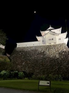 ライトアップされたお城と夜空の三日月が、なんとも幻想的でした。