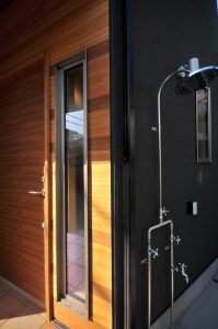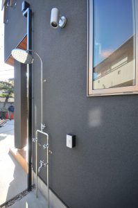 まず、サーフィンから帰ってきたらカラダやサーフボードを流せるよう外シャワーを設置しています。