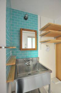設計当初は、アートテラスホーム標準仕様の造作化粧台(木製カウンター)で計画を進めておりましたが、壁にタイルを貼ったり、棚を付けたりと打ち合わせを進めていく中で、サーフィンをやるご家族みんなが気にせず利用のできるシンクが良い!となり、採用する形になりました。