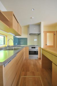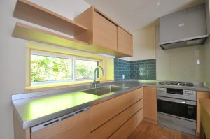また、キッチン・アイランド作業台ともに横長のキッチン窓がある事によって明るさも確保されています。