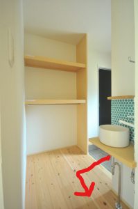ドアを開け上記の→のような動線だったり、ドアを開けホールへ行ってから2段の棚に服をかけ手洗いをする。