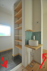 手を汚して帰ってきても、靴を脱ぎ手洗い場がすぐの位置にあるのは今の時代に合った計画ですよね。