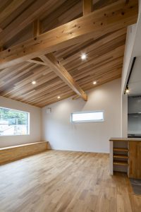 こちらのお家では、リビング天井にレッドシダーを張っています。