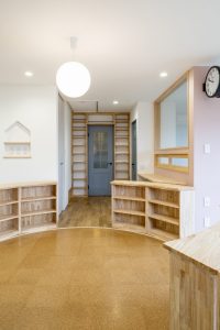 ご家族の集まるリビングには、ソファなどは置かずに基本的に床でくつろぐ・床で本を読むためにコルクの床を円状に採用しました。