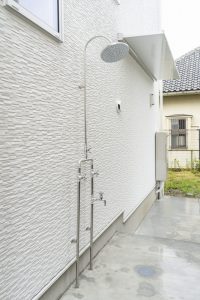 マリンスポーツを楽しむお家として、玄関右横には温水のシャワーを設置しSUPボードなどを洗ったり置いておいたりするスペースも作っております。