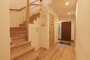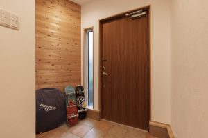 また、写真のように玄関入ってすぐ右の場所にも同じ天然木を使用し玄関のアクセントと共に床材と同じ木材を使うことで全体の統一感を作りだすことが出来ました。