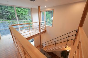 高気密高断熱の家だからこそ出来る大開口サッシで明るいだけでなく、周りの緑と一体化された階段になっているのが分かります。
