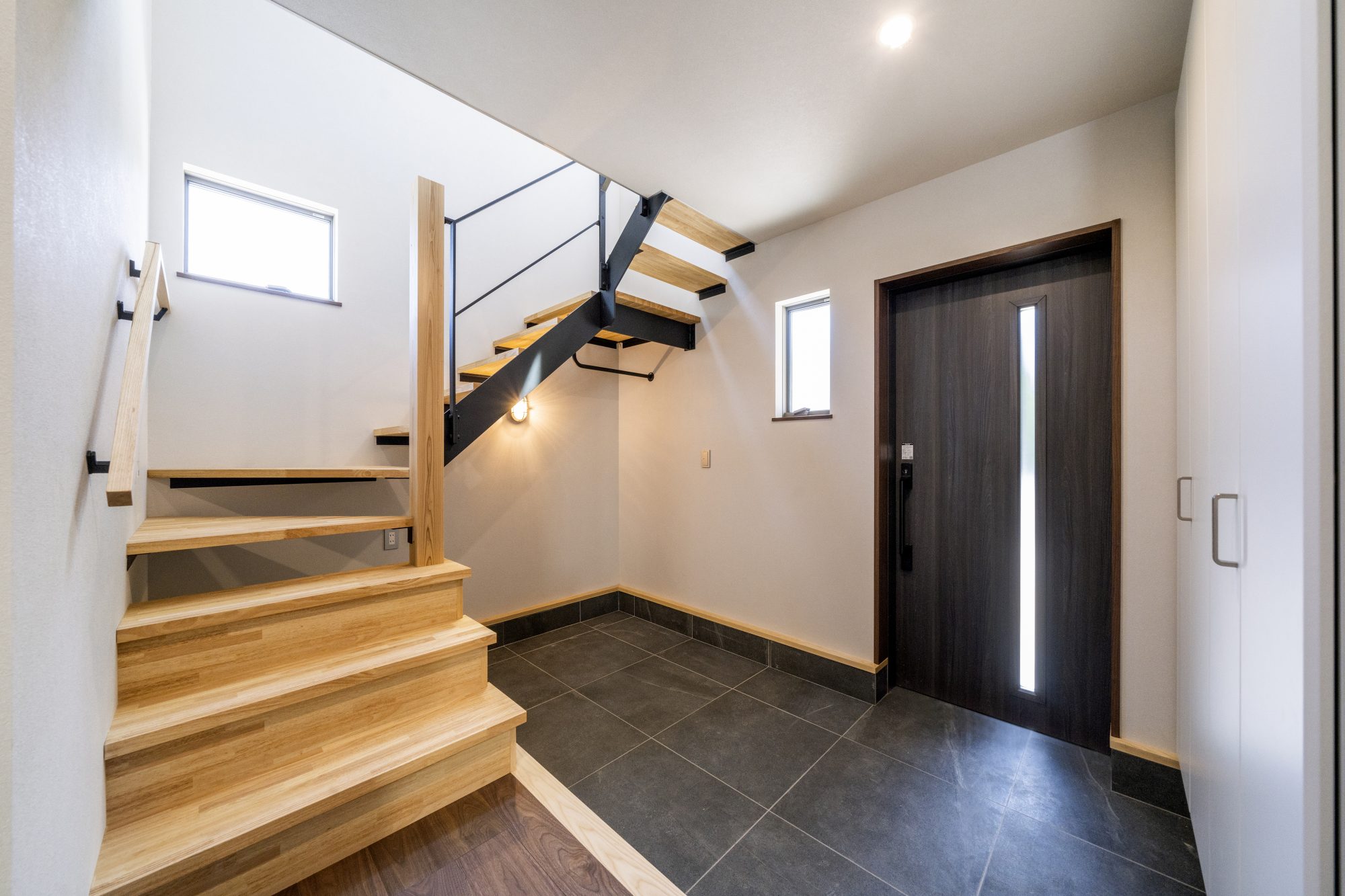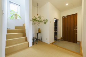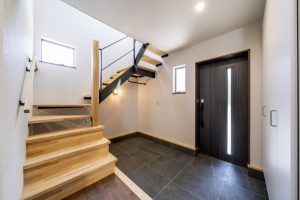 アイアン手摺・階段下スペースを有効活用することで、広々としたシックな玄関となりました。