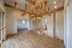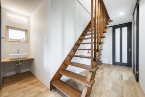↑ 横浜市金沢区に建つ新築の一邸。断熱・気密・空調計画により階段は吹き抜けにし、2階も自然光がたっぷり入るフリースペースを設けています。自然光を多く活用するため、軒の長さの計画もしっかりと行っています。