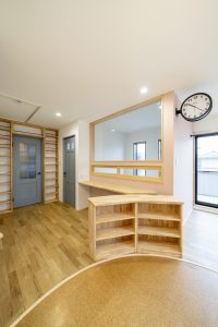寛ぎスペースとなる床の円部分にはコルクを使い基本的には家族みんなで床でリラックス出来るようにしています。