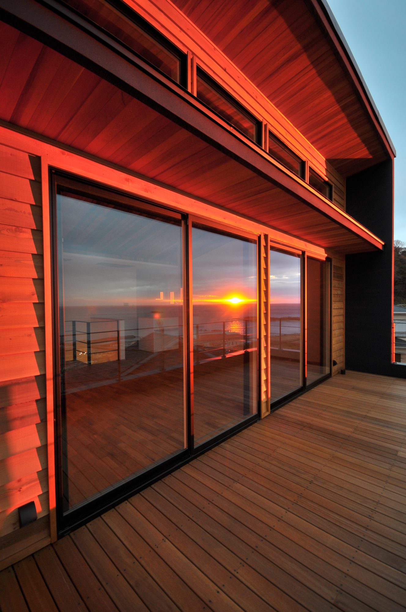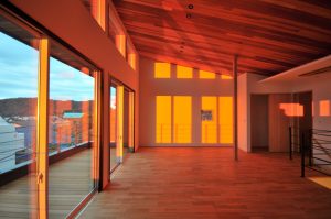 窓に映る夕日・夕日が差し込む室内