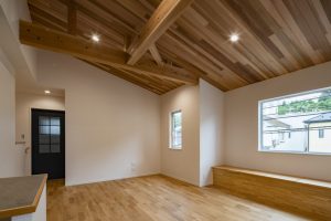 勾配天井はデザイン性が高くなります。勾配天井で見せる梁にすることで、モダンかつスタイリッシュな印象を与えます。これにより、お部屋のアクセントになり住宅の価値を高めることが出来ます!
