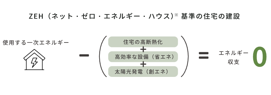 ※ZEHとは「快適な室内環境を保ちながら、住宅の外皮断熱性能を大幅に向上させると共に、高効率設備によりできる限りの省エネルギーに努め、太陽光発電等により、創ったエネルギーと消費する住宅のエネルギー量が正味で概ねゼロ以下となる住宅」を指します。