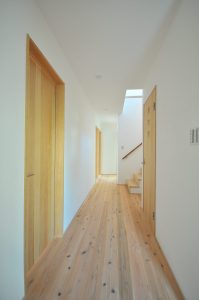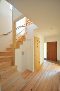 1階玄関周りの壁:漆喰壁・床は静岡県の天竜杉を採用しました。