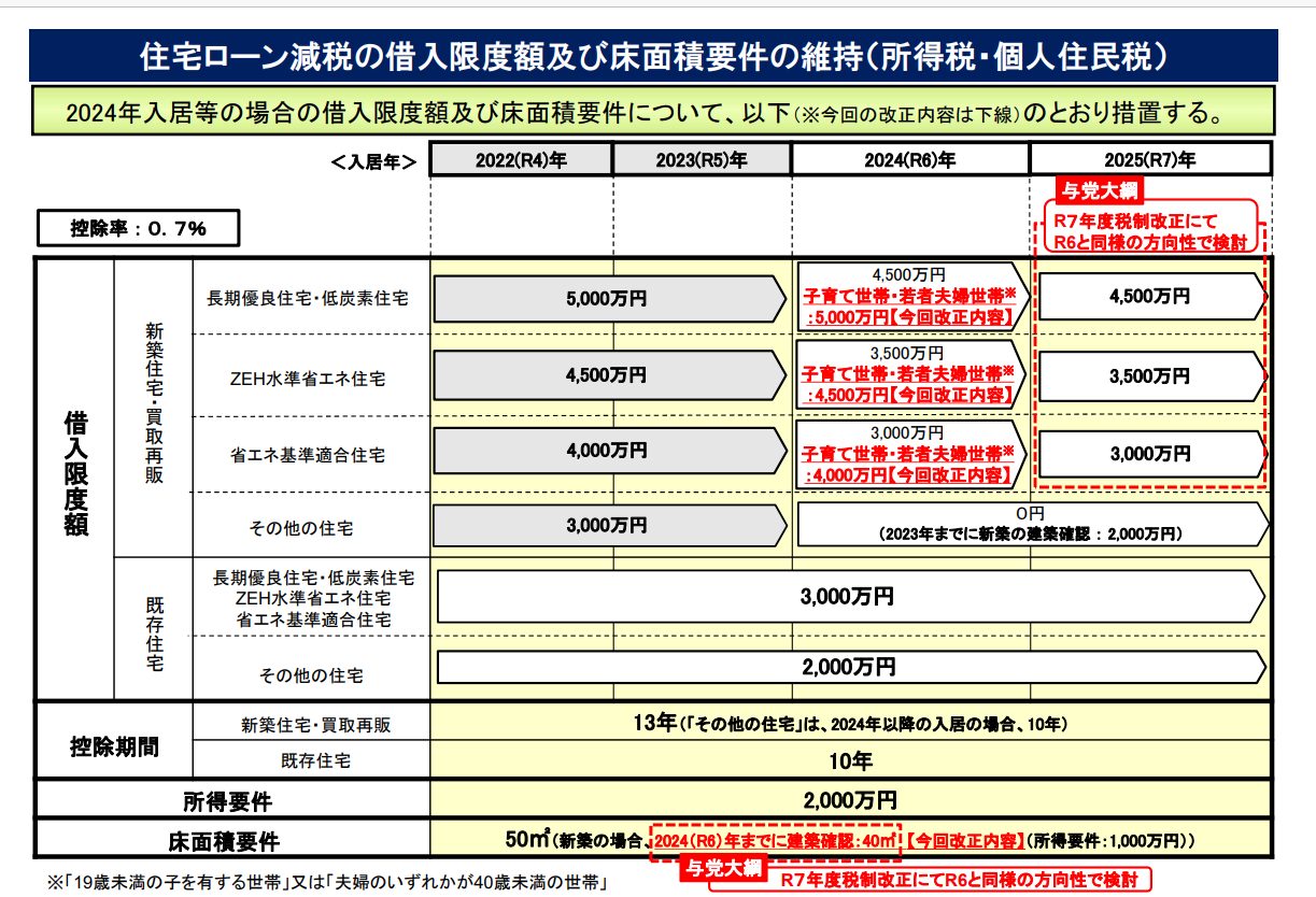 2024年から引き下げられる予定でした「借入限度額」ですが特定の2世帯、子育て世代・若者夫婦世帯に限り「借入限度額」が据え置かれました。