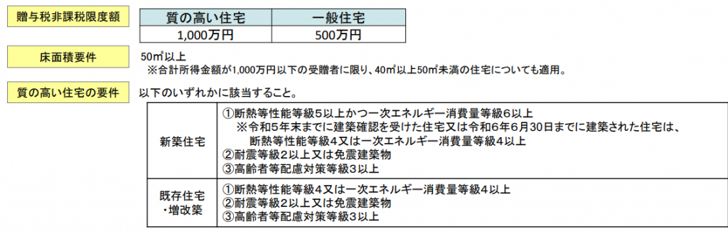 省エネ住宅・耐震・バリアフリーのいずれかがクリアしている「質の高い新築住宅」であれば贈与税が非課税となる限度額が1,000万円まで・それ以外の新築住宅は500万円まで増額されます。