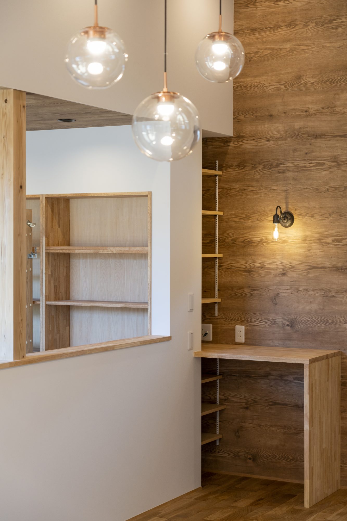 ↑デスク横には本来デッドスペースになってしまう本棚裏に見えない収納を作り、書類などのごちゃごちゃとしやすい物を収納できるよう工夫しました。