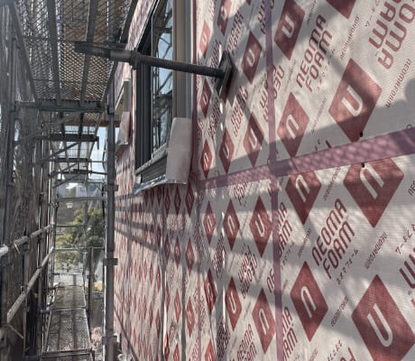 建物を包み込み、高い断熱性を実現。結露の原因となる部屋間の温度差を解消し、木材の耐久性を維持。充填断熱ができない木部の熱橋を抑える効果があります。