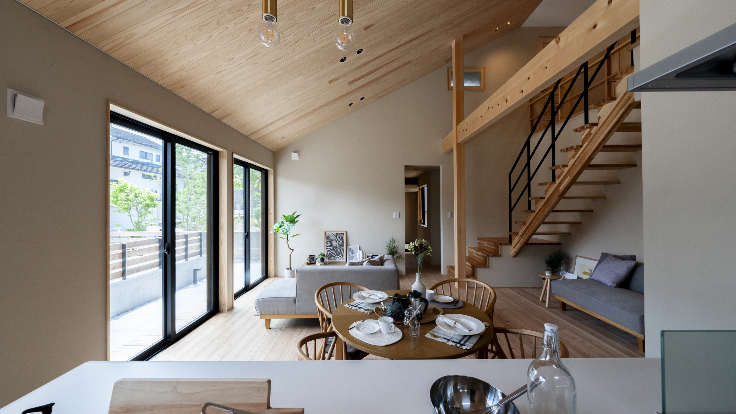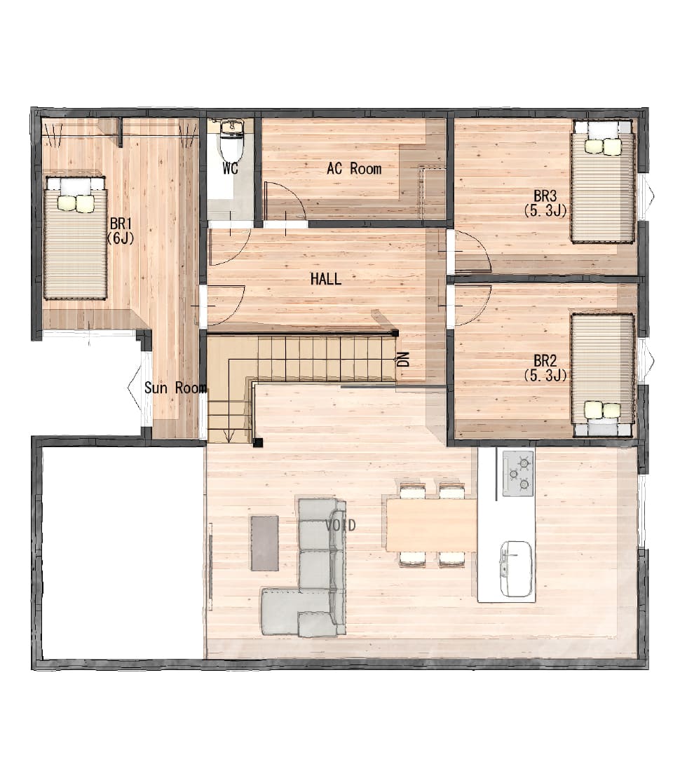 日々の生活を楽しむ“ゆとり”を持たせる間取りへ大胆に変更。勾配天井のLDKは人が集まるバイパス空間となるよう南側いっぱいに拡げ、2階へのアクセス、ウッドデッキや家庭菜園スペースへのアクセスなど、つながりに連続性を持たせた空間設計に。また、つながり合う空間においては、換気や空調の効率化に期待ができます。
