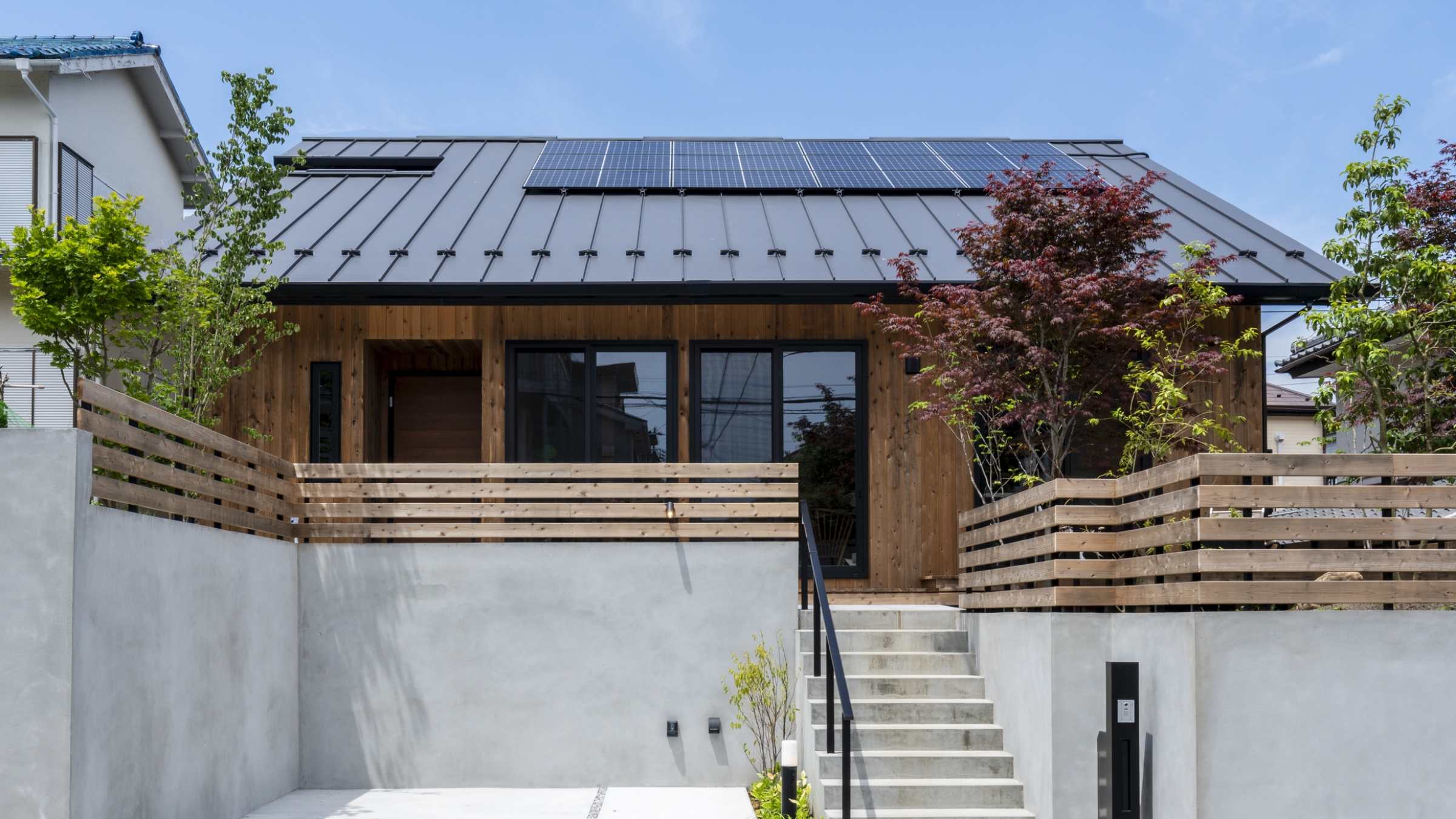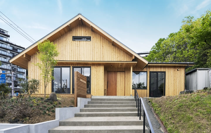 静岡県天竜杉の羽目板をふんだんに使った外観と、太陽光発電を設置するにあたり発電量効率が期待できるよう南面に大きな切妻屋根としました。