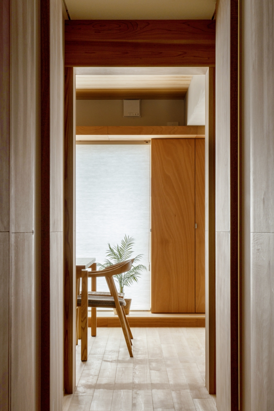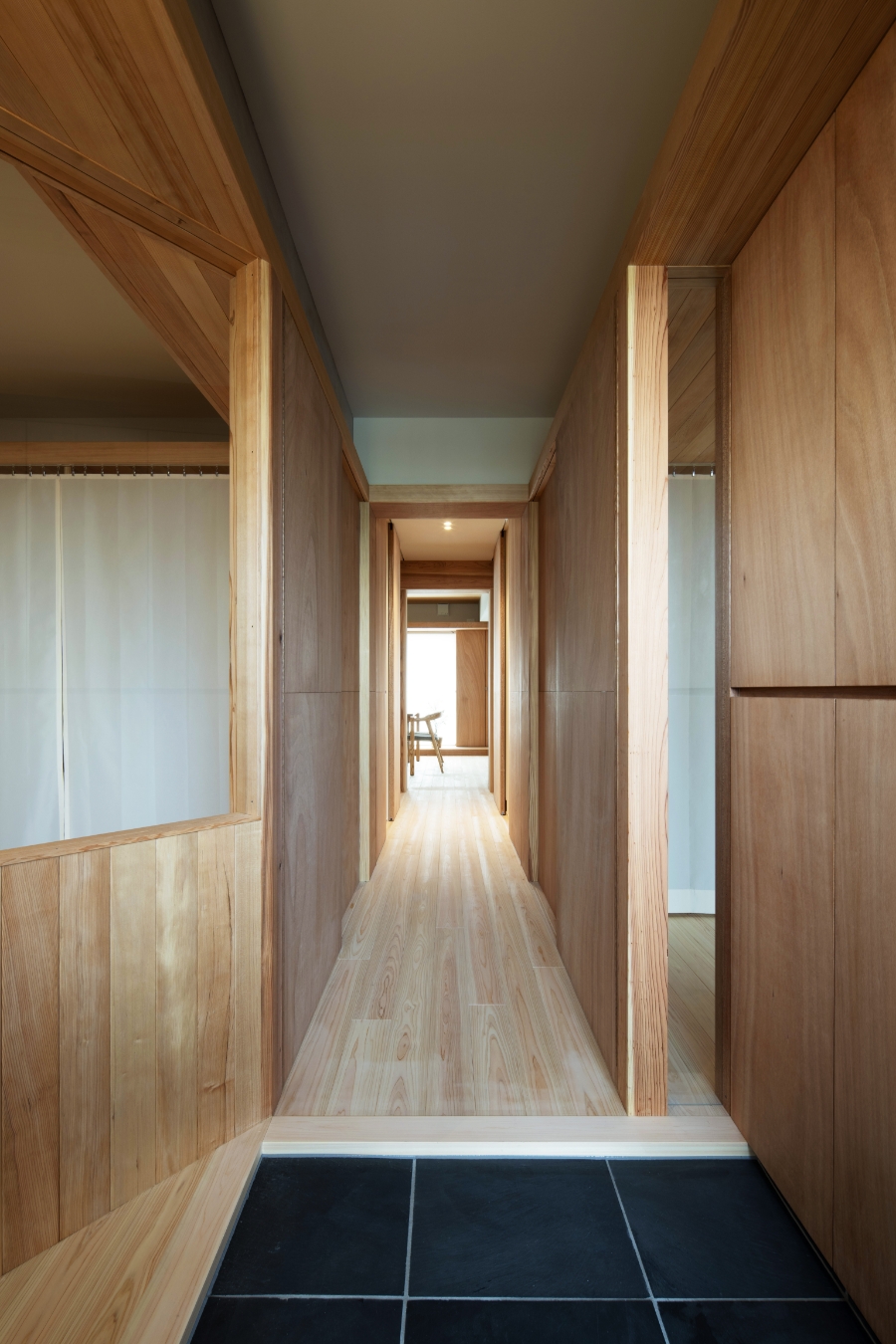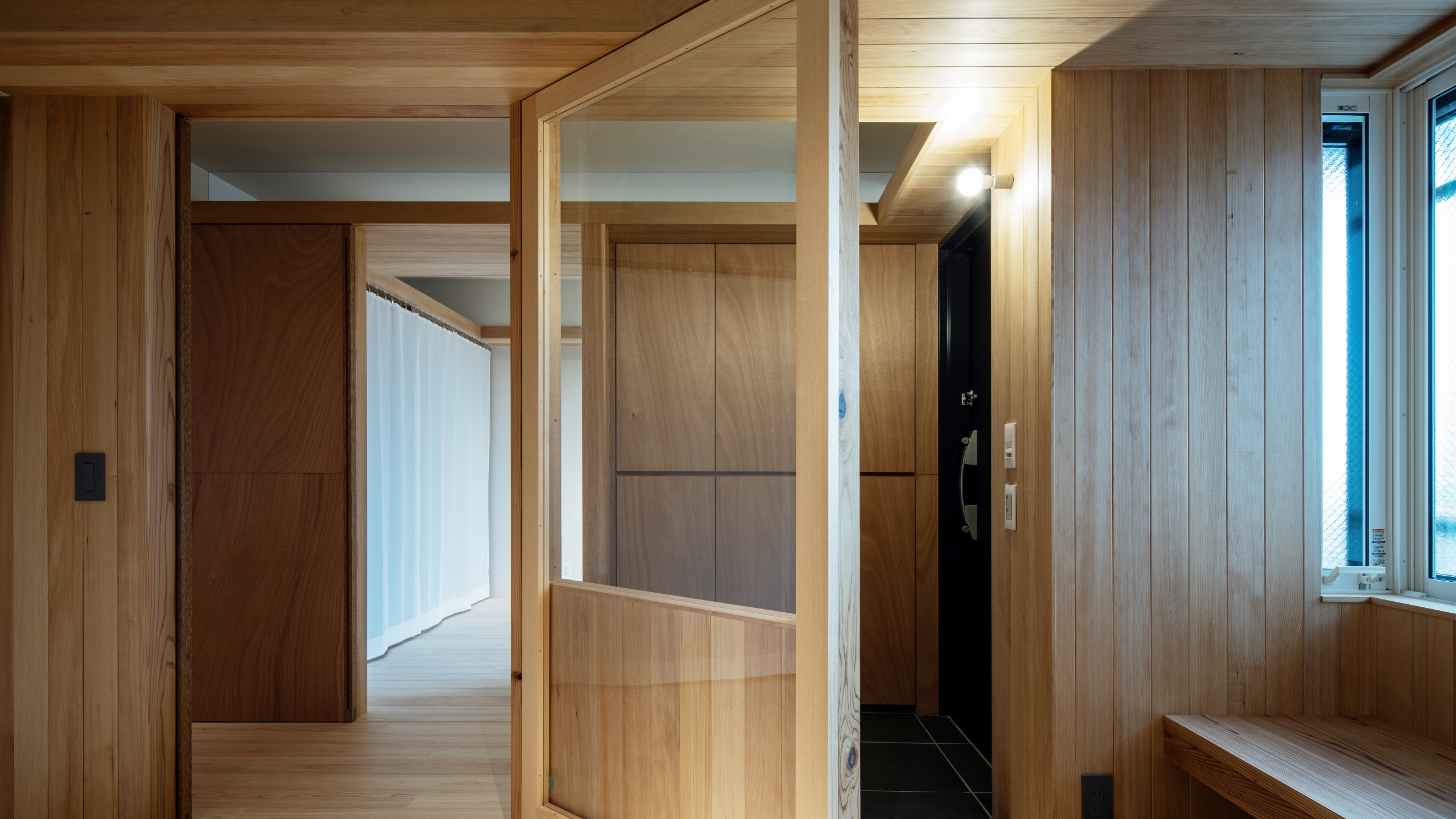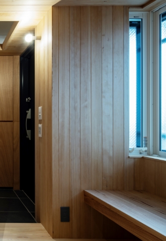 空間を斜めに切り取り、いわゆるマンションらしい玄関を拡げ、内廊下からの明かりをエントランス空間に取り込んでいます。さらに、窓の下には腰掛けられるベンチを設置し、ちょっとした時間を愉しめる空間の“遊び”を持たせています。