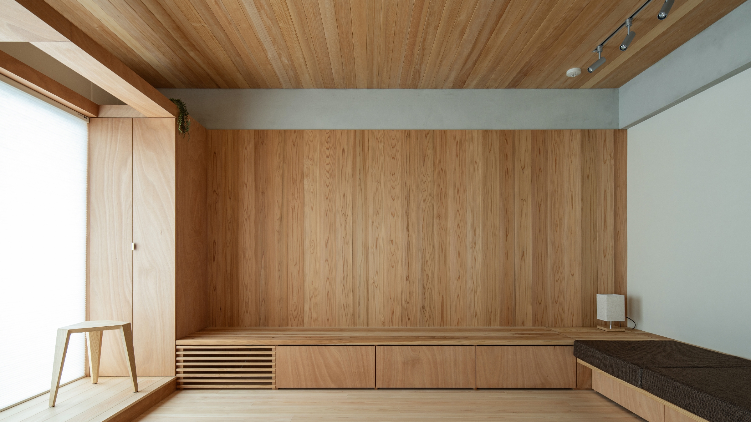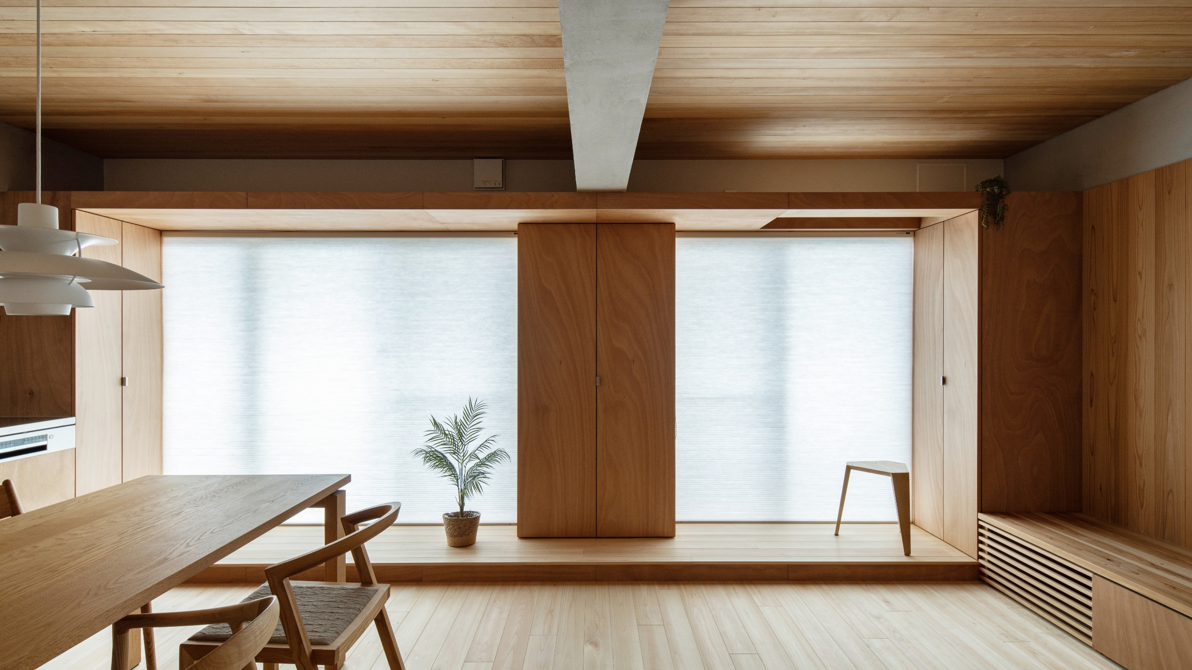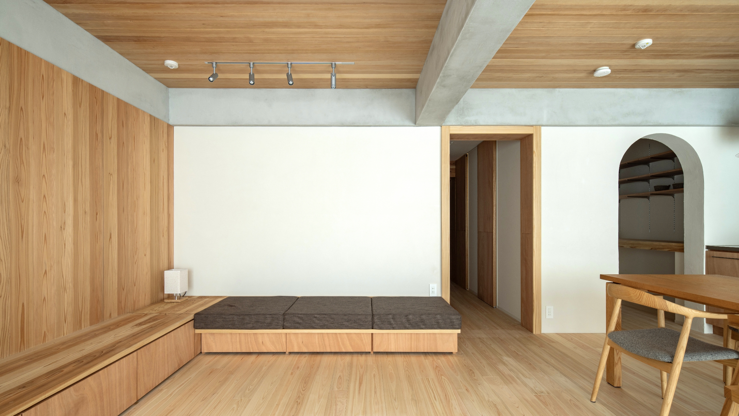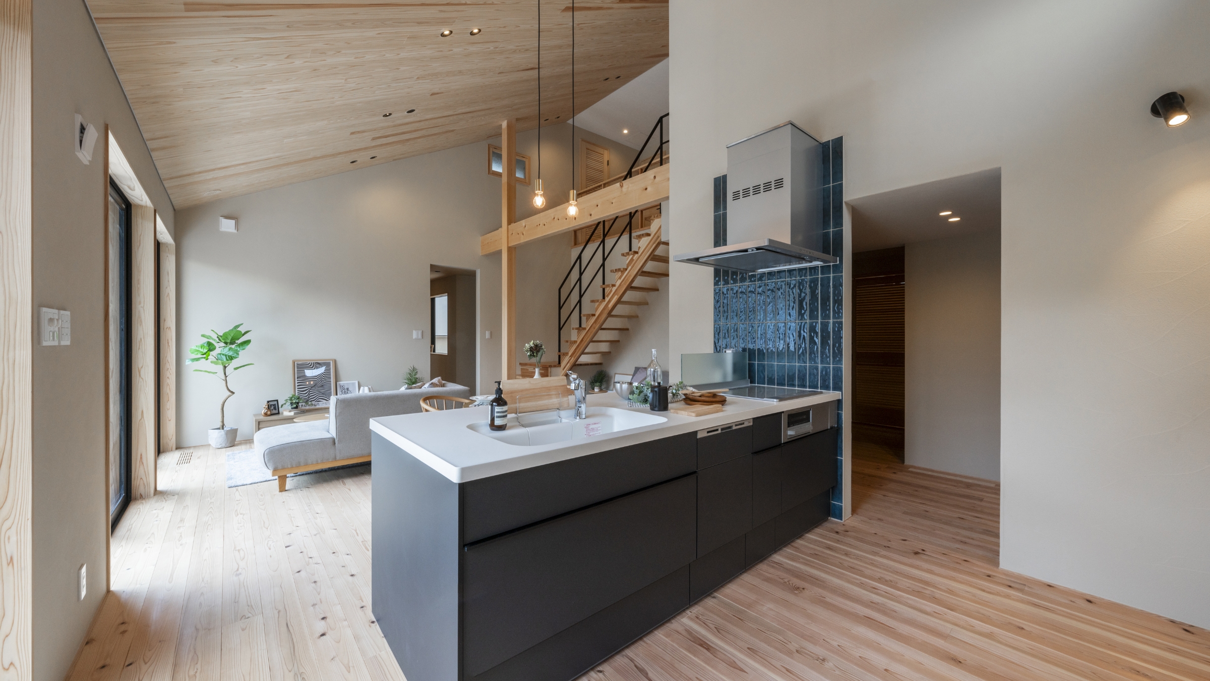 木の匂いでいっぱいの廊下を進んだ先には、冷蔵庫やパントリーをリビングから見えない部分に設えたことですっきりした印象を与えるキッチンと、断熱効果を高める内窓からたっぷりの陽射しが注ぎ込むリビング空間。床面は室内とバルコニーがシームレスにつながった印象を持たせられるように、窓枠の段差分を一段上げ、空間を印象付けるデザインのアクセントとしています。収納を兼ねた造作ソファからL字型に続く小上がりスペースは、天井、壁、造作、床と様々な樹種の表情を愉しめ、テレビを置くという機能的な目的以外に、暮らし方に自由な発想を与えてくれます。反対側のキッチンの壁は白いタイル貼りでガラリと違った印象。どこを切り取っても美しい自然素材の空間です。