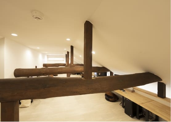 もともと別店舗だった建物に性能向上リノベーションを施した新事務所。ロフト部分に古材の梁を使うなど、